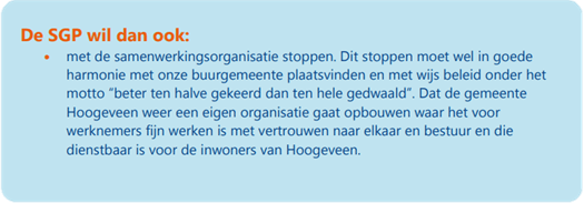 Ondanks deze forse toename van uitgaven is de SWO er organisatorisch niet in geslaagd om de kwaliteit te leveren die Hoogeveen dringend nodig heeft. De SGP is dan ook van mening dat deze vorm van samenwerking geen verantwoorde besteding is van belastinggeld en onvoldoende bijdraagt aan een goede en dienstbare overheid voor onze inwoners.