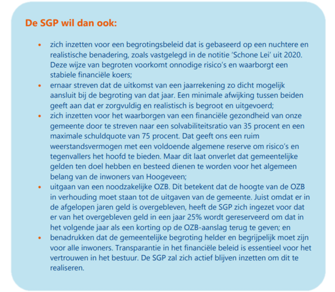 De SGP vindt het van groot belang dat de financiële middelen van de gemeente met zorg worden besteed en beheerd. Het gaat om geld van de inwoners en dat moet op een verantwoorde manier worden besteed. Iedere uitgave moet bijdragen aan het algemeen belang en ten goede komen aan de leefbaarheid en toegankelijkheid van het publieke domein.