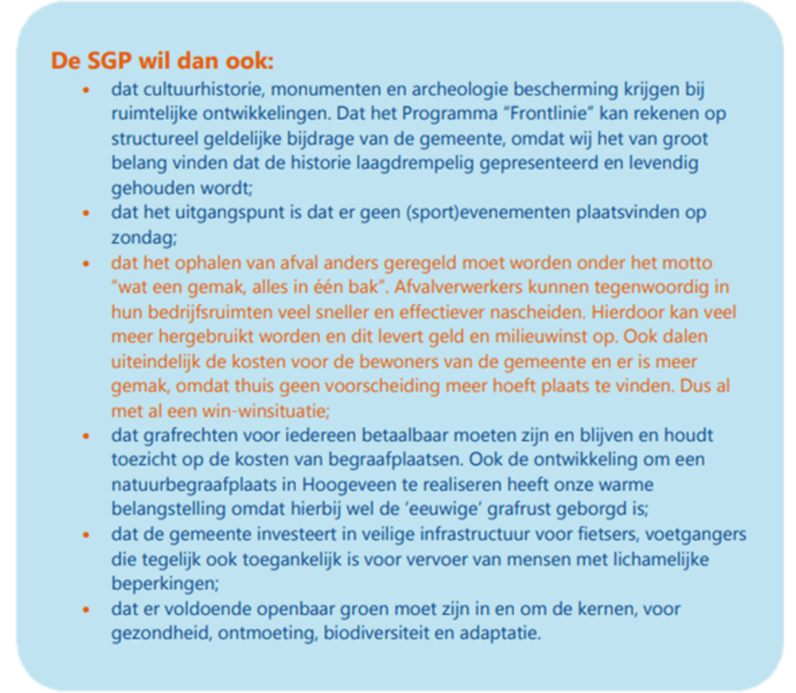 De SGP ziet de fysieke leefomgeving als een verantwoordelijkheid die vraagt om zorgvuldigheid, visie en respect voor wat ons is toevertrouwd. Een goed ingerichte en onderhouden fysieke leefomgeving heeft invloed op, en zal bijdragen aan het welbevinden van onze inwoners. Vanuit het Bijbelse rentmeesterschap willen we zuinig omgaan met ruimte en natuur.