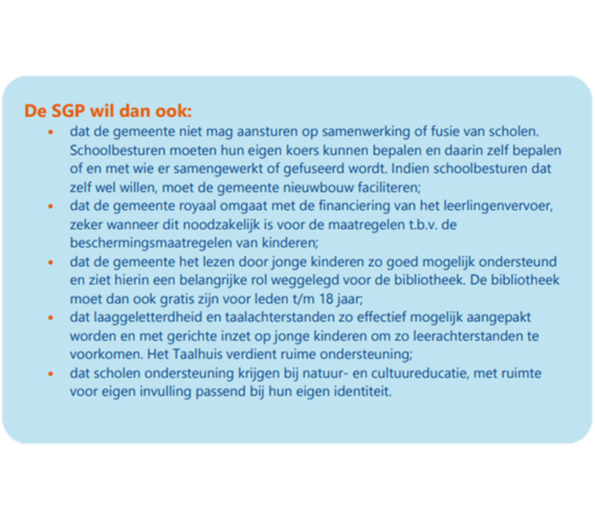Nederland heeft een goed en bijzonder onderwijssysteem. In ons land worden niet alleen openbare scholen door de overheid bekostigd, maar ook scholen die door burgers (vaak ouders) zijn opgericht (dit zijn bijzondere scholen). Voor de SGP in Hoogeveen is het dan ook belangrijk dit te borgen in onze eigen gemeente of anders vlakbij in de regio. Eigen (bijzonder) onderwijs moet ook op gemeentelijk niveau gefaciliteerd worden, want het gaat om de opvoeding van onze kinderen. De betrokkenheid van ouders is belangrijk voor het onderwijs en de leerlingen. Die moeten we koesteren.